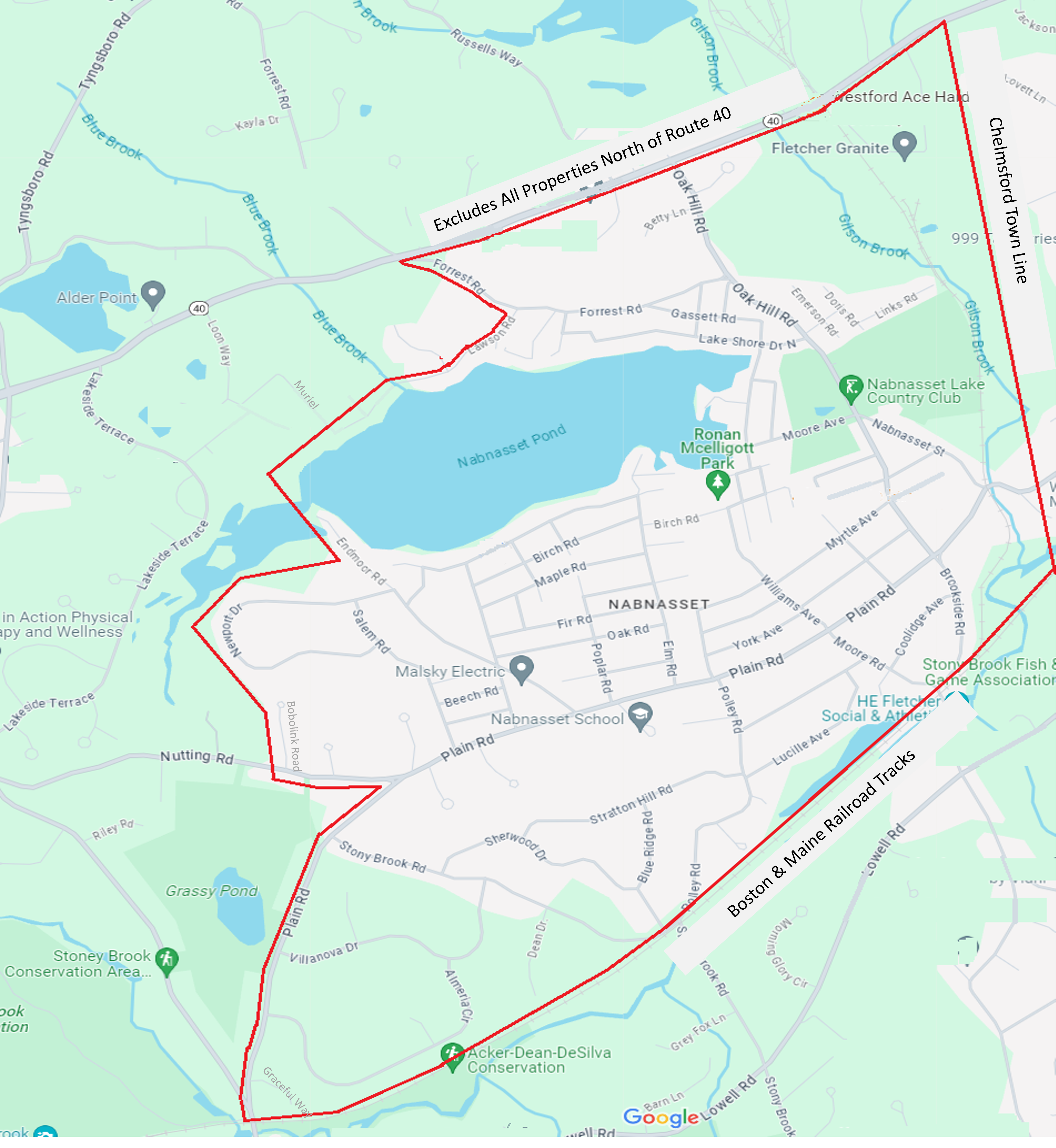 South side of Route 40 (Chelmsford Line) from Chelmsford town line to Boston and Maine Railroad tracks to intersection with Depot Road. Plain Road to intersection with Nutting Road. From Nutting Road to intersection with Bobolink (Nutting Road #16). From end of Bobolink following a line to intersection with Nabnasset Lake, following the western shoreline of Nabnasset Lake to Muriel Drive, following Lawson Road to intersection of Forrest Road. Forrest Road to intersection of Route 40 (House #434). House #434 on Route 40 easterly on Route 40 to intersection of Chelmsford town line. This excludes all properties north of Route 40.